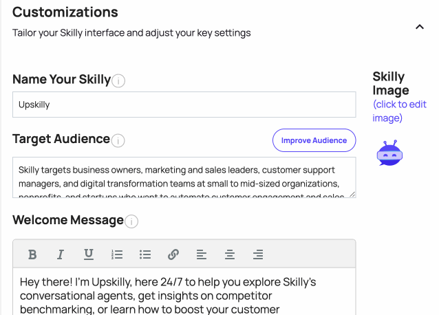 - Target Audience: gives skilly an idea of the kind of person your user is most likely to be. What are their typical roles & responsibilities? What overarching needs do they tend to have? skilly takes an educated guess about the target audience based on your website, but you can rewrite it as you see fit, or click "Improve Audience" once you've uploaded additional knowledge, and skilly will automatically revise its understanding of your users.