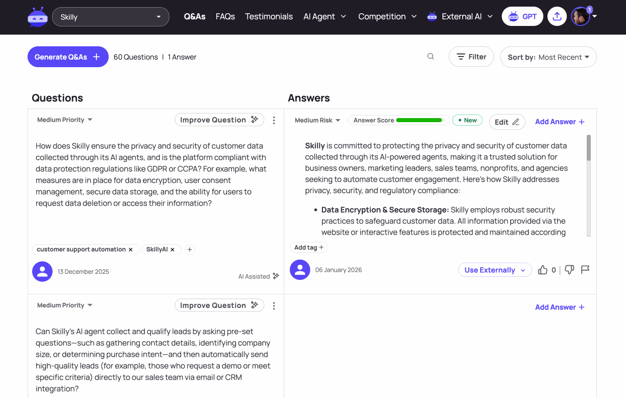 - Risk: this is sort of the complement to the Priority feature on the Questions side. Skilly calculates it to assess the level of confidence in the answer's accuracy, and the level of differentiation in the answer (i.e., how much does this sound like an answer that is unique to your organization and the value it brings). Just like Priority, the Risk classification is useful for finding the most important Q&As to work on with your team.