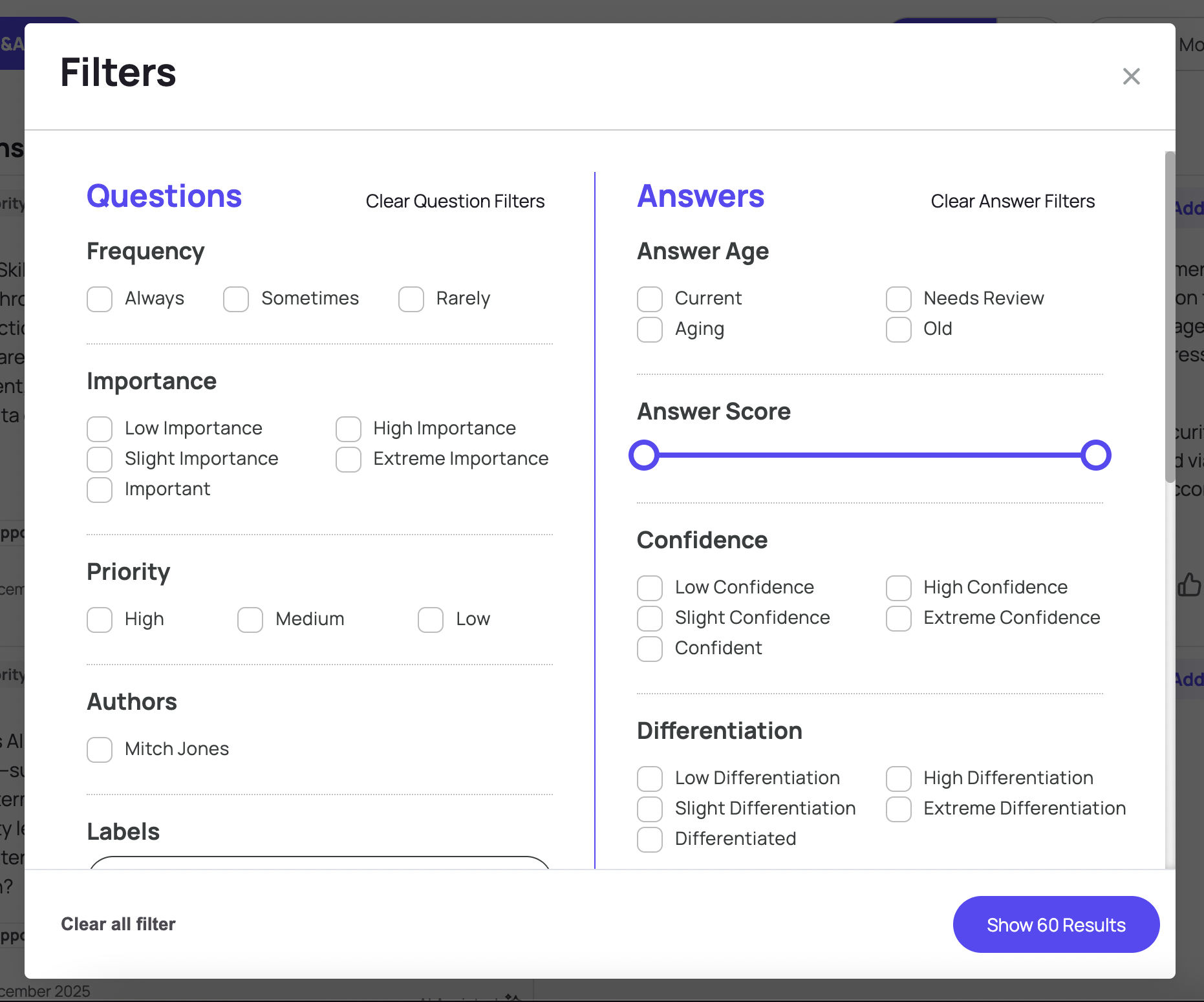 Have team members focus on Q&As that are high Priority, ask your subject matter experts to review the oldest answers on a topic, or use the "Always" Frequency filter to invite client-facing staff to answer the questions they're fielding every day.