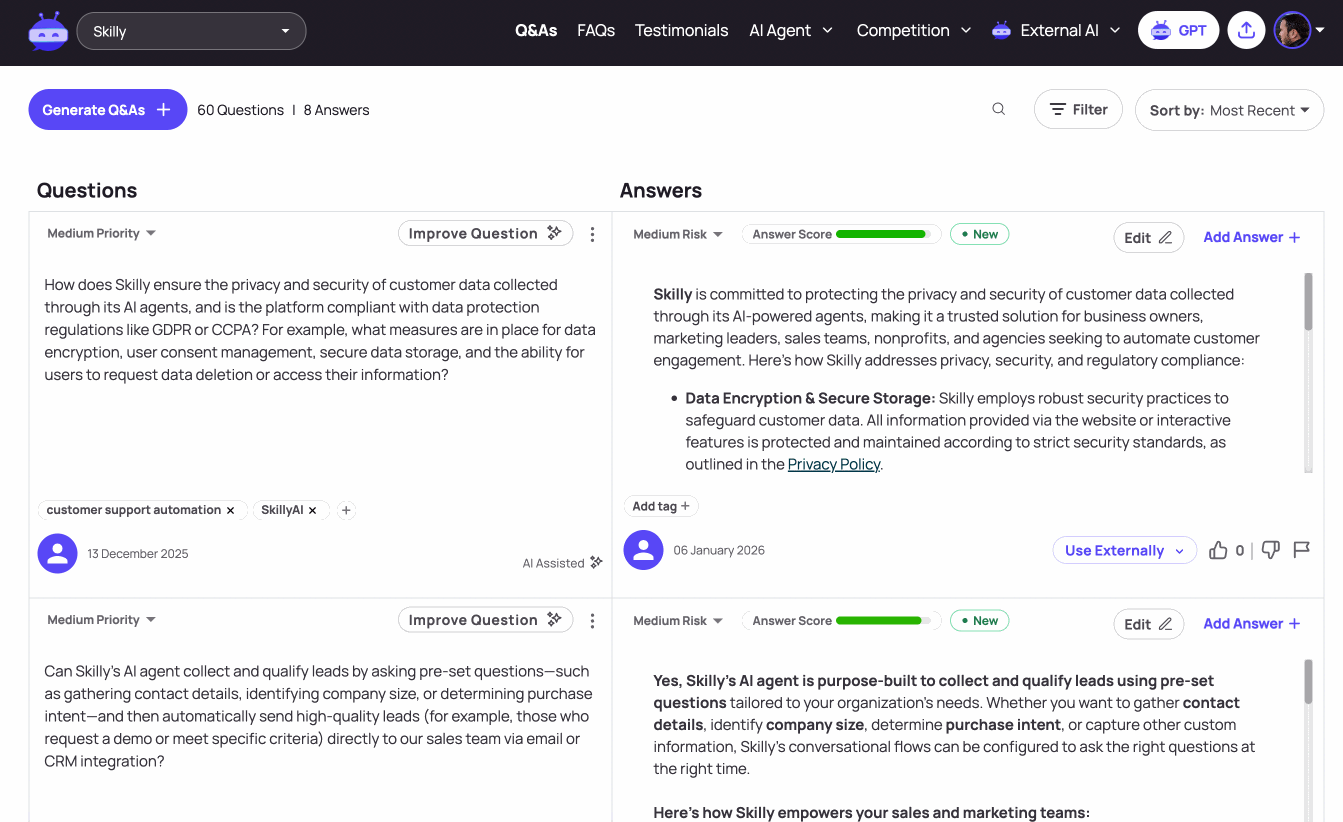 Most of the public information about your organization is, naturally, generated by your own team. Yet, the most convincing information is what others have to say about you. For this reason, testimonials (be they from clients, users, or partners) are foundational to building an authoritative and differentiated public presence. What's more, this content becomes vastly more useful inside skilly, because as an AI guide, skilly will be able to contextualize this testimonial content in its knowledge base (and share the testimonials with users when opportunities arise.)