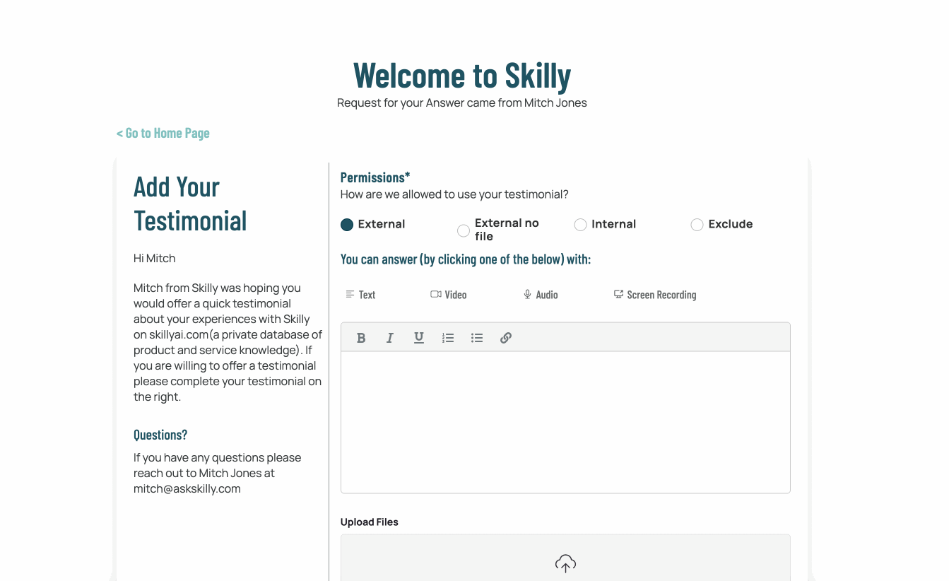 Once the URL is live, anyone who clicks it will be taken to a brief page to enter their name and any other relevant information. They will then be taken to our Testimonial Submission interface: