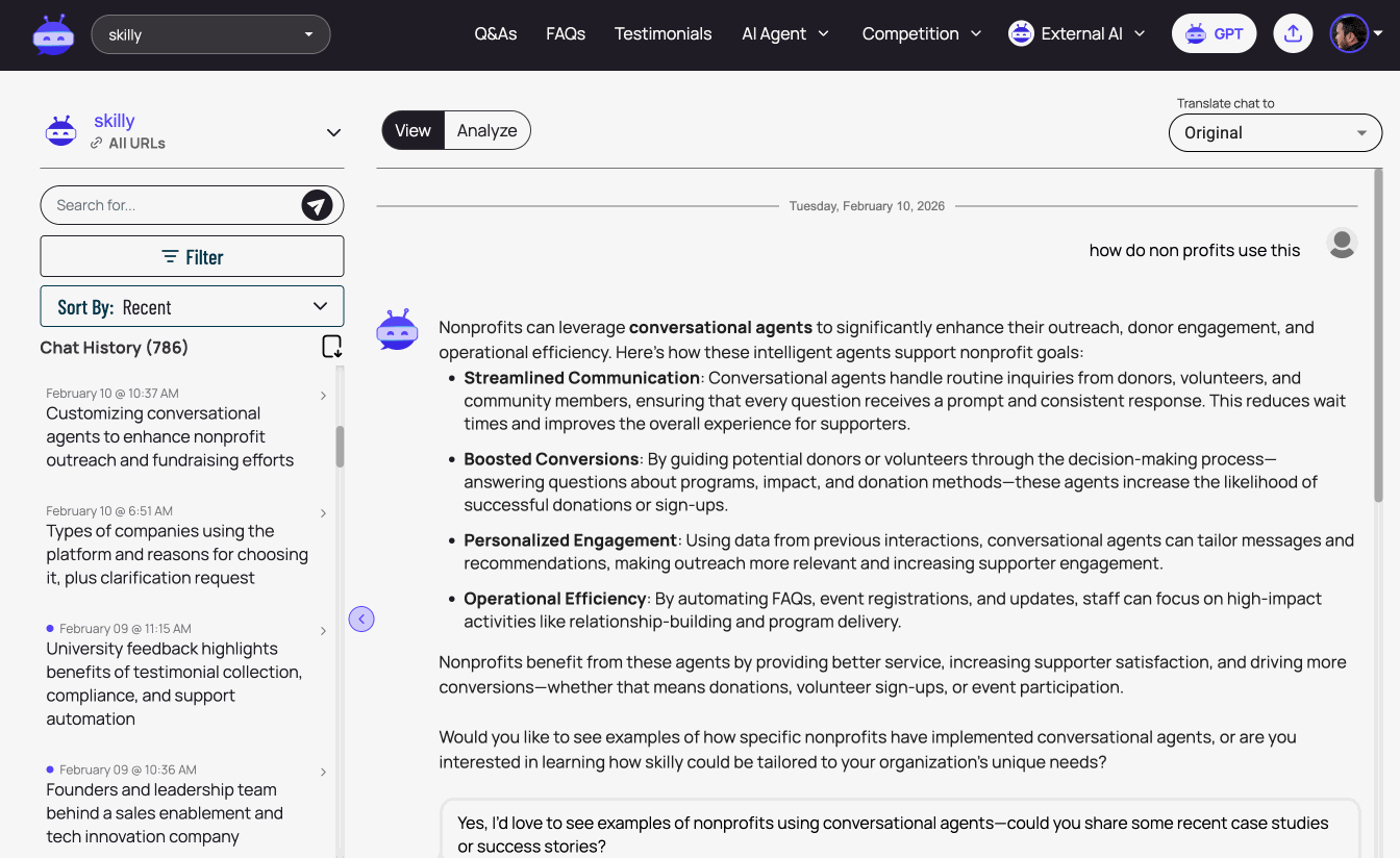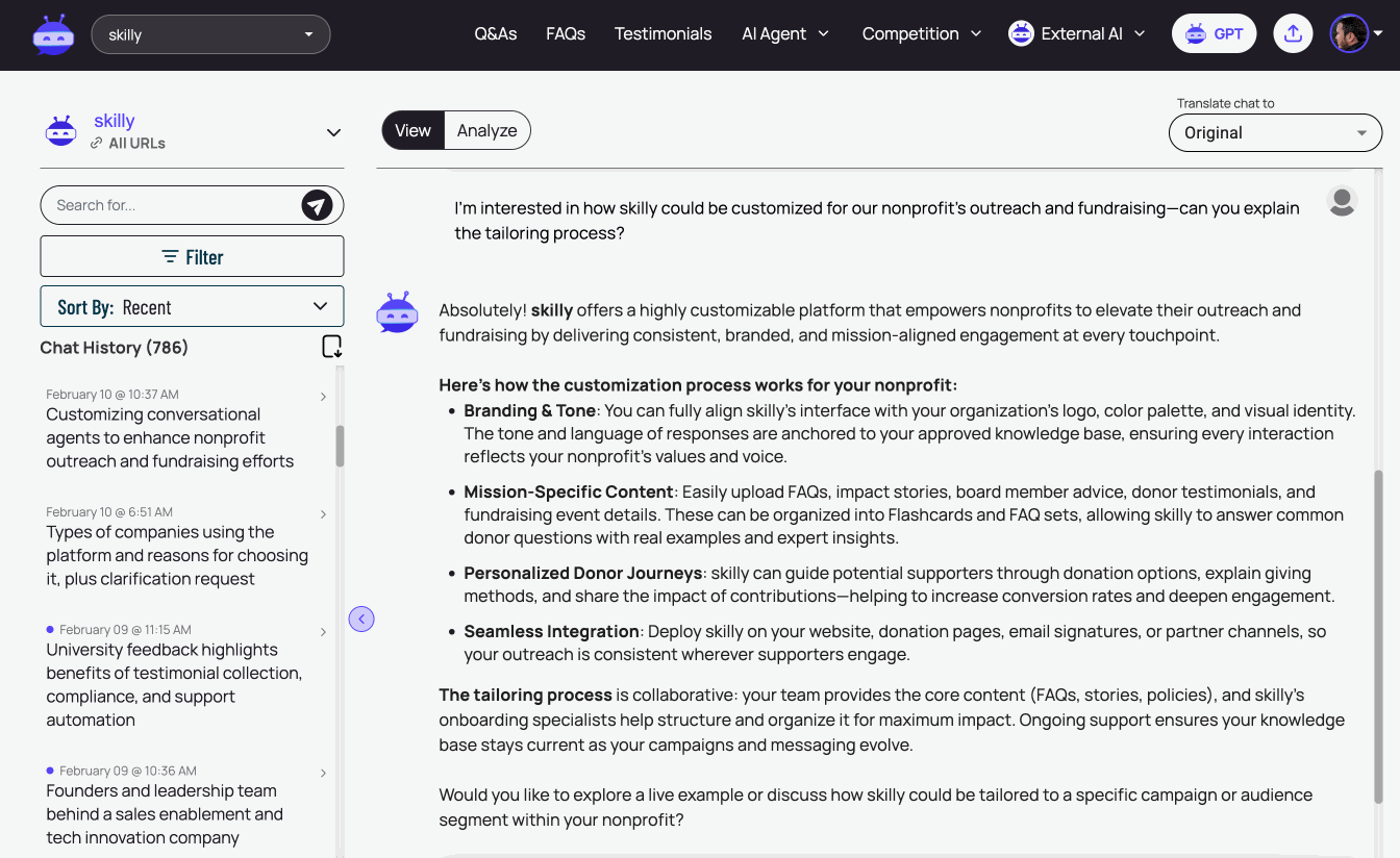 Where the Conversations section really shines is in your opportunity to Analyze them: in reviewing the conversations and providing feedback where skilly's responses were strong vs weak, your skilly learns how to give better-aligned answers in the future.