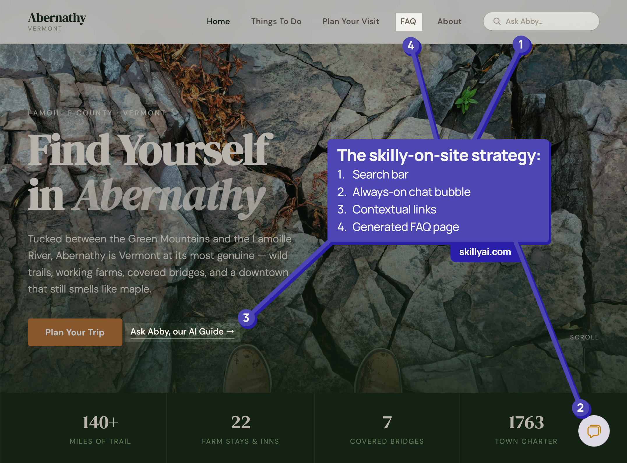 The easiest way to get your skilly in front of website visitors is simply to copy its URL and paste it into whatever context you like. In the webpage below, you can see this in action with feature #3, "Ask Abby, our AI Guide":