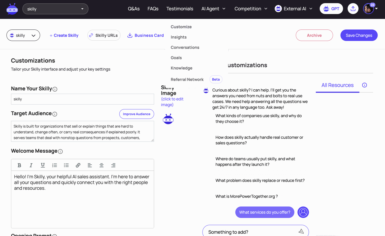 And remember, because you can create multiple skillies with their own unique URLs, you could decide to use them for distinct purposes and with different goals in mind (for instance, you might use one skilly on your public/marketing website, and another on your customer portal, where the former is pursuing the goal of generating leads while the latter is pursuing customer satisfaction). This approach is also valuable when reviewing your analytics and insights, which are tied to each individual skilly.