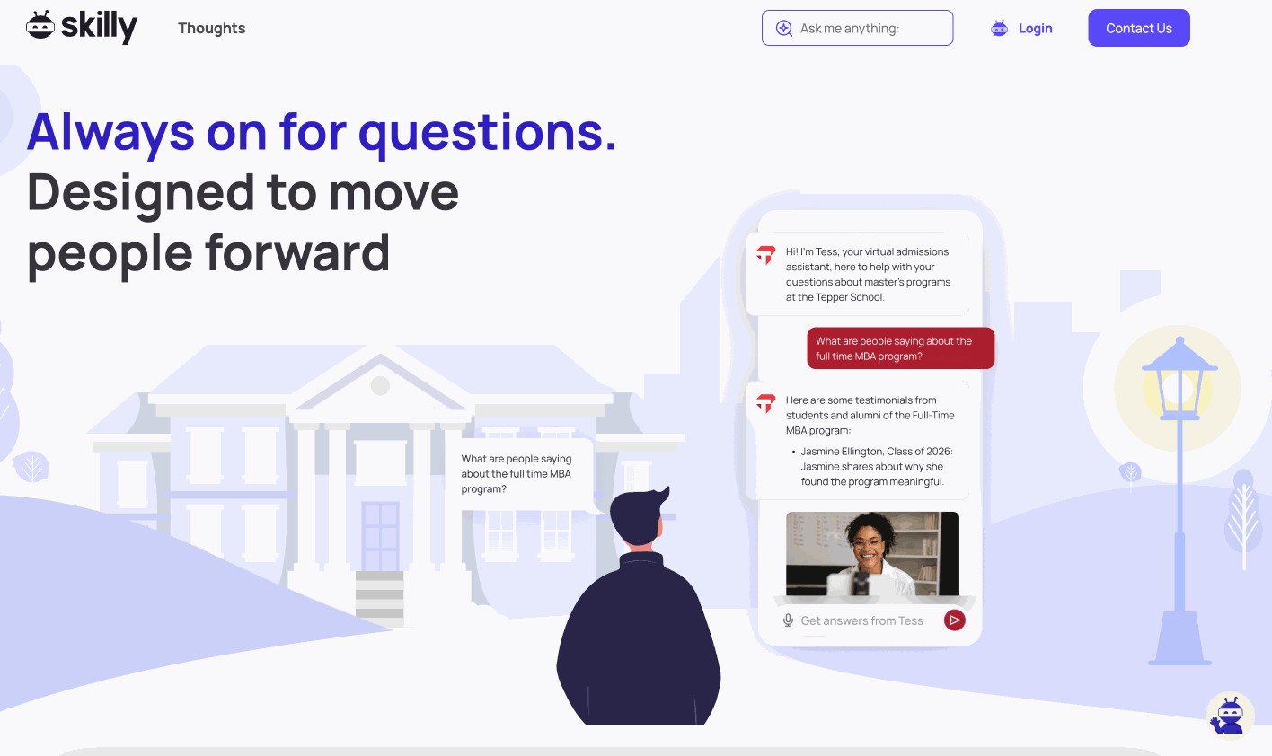 In most cases this is a significant upgrade to your standard search experience because it's not just a one-and-done Q&A; skilly provides the initial answer and can then clarify, redirect, or otherwise assist your user in reaching their end goal (all while keeping your goals in mind).