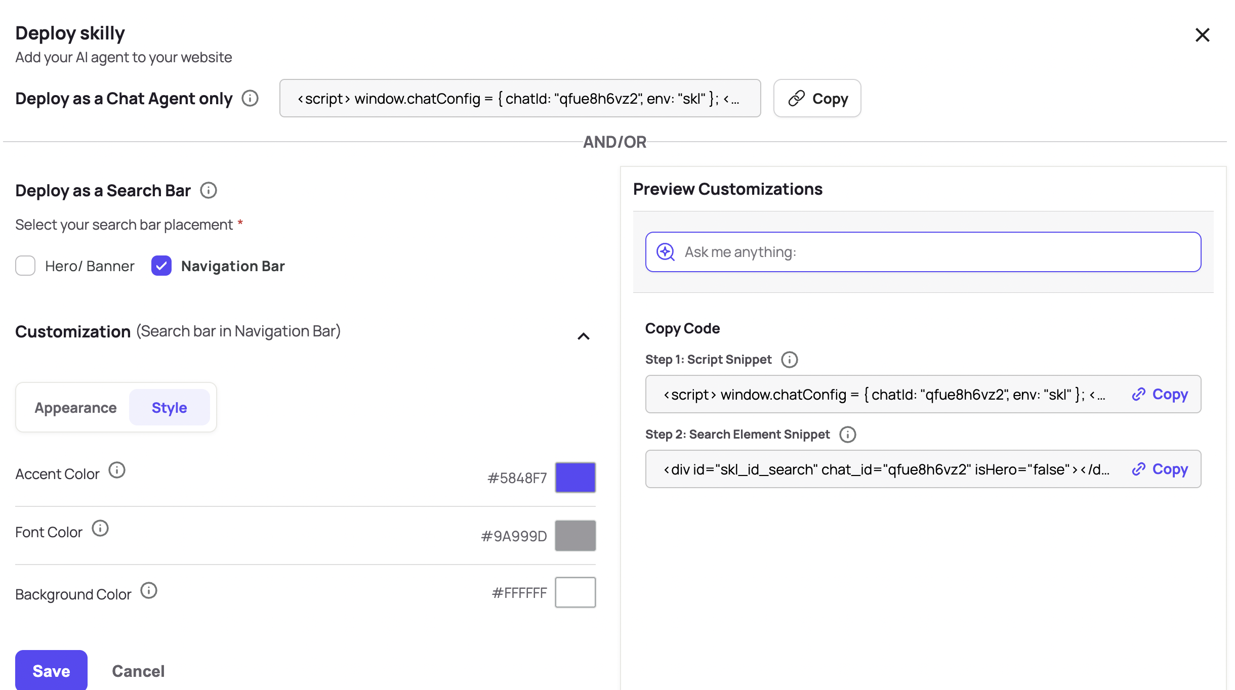 If you already have the chat bubble script installed on your site, then adding a search bar interface is even easier. It's just one new line of javascript to be copied over, while all your customization of the feature happens inside the page where you grab your code snippets: