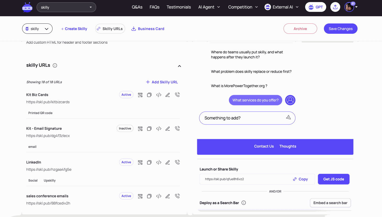 The possibilities for deploying your skilly on social & communication channels are virtually endless, so it's worth taking the time to create all the URLs your team can come up with; in fact, we've seen clients turn it into a fun team-building challenge: "how many use cases for publishing an AI Guide can you dream up"?