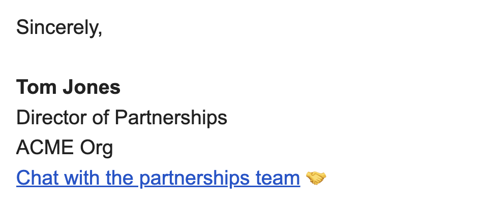 Each department's signature will likely have a specific call-to-action that resonates best with its audience. What rings true across your org is that the link in an email signature lets your reader know they can have a dialogue with your organization outside the times and limitations of the people working there. As a great example, if your org is short on Spanish speakers, you could simply offer a "Se habla español" signature link that opens a skilly landing page.
