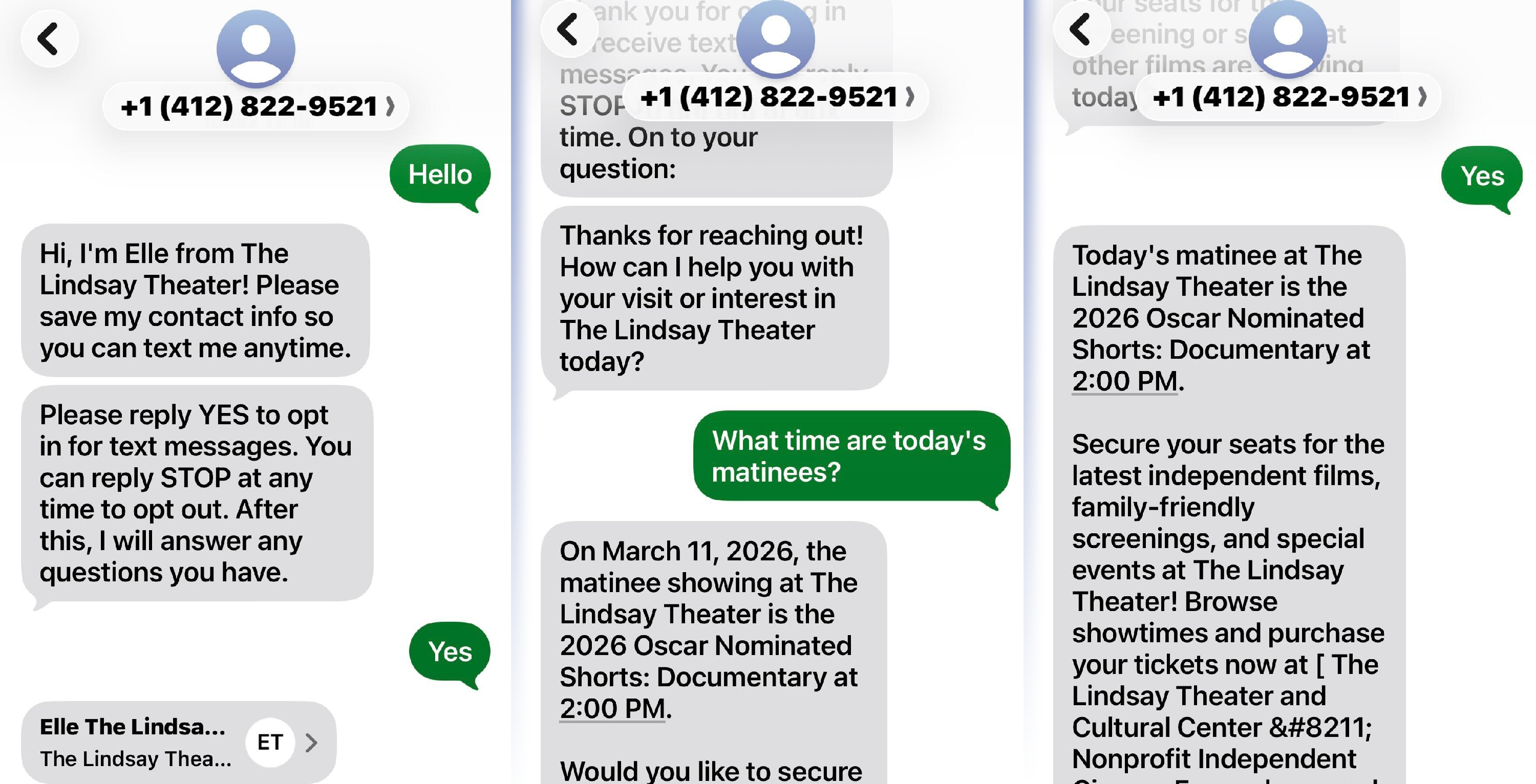 Every skilly comes with an SMS number users can text for a light version of the same conversational experience they'd get on your website. Here's a chat with The Lindsay Theater from a user interested in today's matinees: