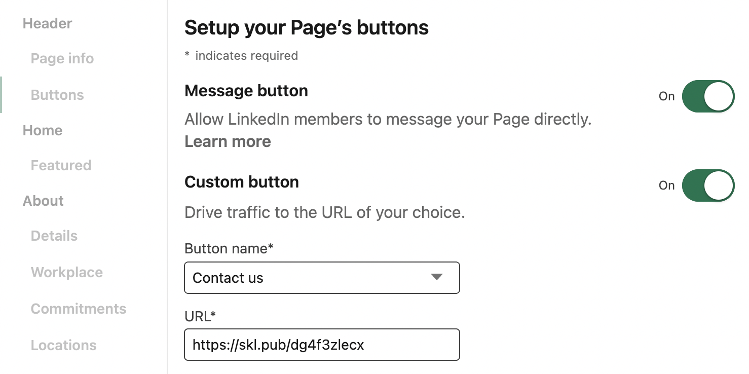 For LinkedIn, note that your company profile's bio will be found under "Edit Page", at which point you'll look for "Buttons" and choose the call-to-action you'd like to use as the label for your skilly URL: